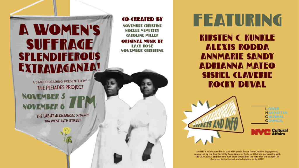 With a mission to approach the women’s suffrage movement from an intersectional perspective, The Pleiades Project team decided to create and produce a new music-theater work, exploring the successes and failures of this milestone event in American history. After being awarded a generous Community Engagement Grant from Lower Manhattan Cultural Council in April of 2020, A Women’s Suffrage Splendiferous Extravaganza! (AWSSE!) was born. With the addition of November Christine (Co-Creator, Writer, Lyricist, and Composer) to our creative team, we tackled the initial stages of developing new a music-theater work. How do we transform AWSSE! from an enthusiastic idea into its upcoming realization as a live staged reading? We then proposed a simple, but crucial beginning that would anchor all of our subsequent work –what stories do we want to tell about women’s suffrage, and how do we want to tell them? After much discussion, we centered the narrative arc of AWSSE! around three aspects of the women’s suffrage movement: