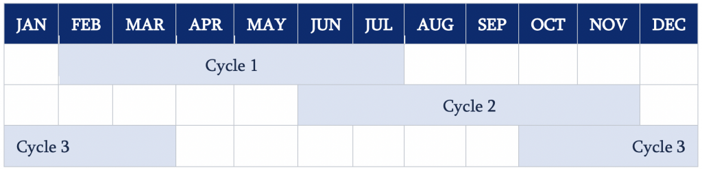 The formal course design process with the LI team is six months in length. Faculty may begin independently prior to the formal process if desired, but the development must be completed by the end of the formal process. The timeline and deadlines are based on the contractual terms, not when students have access to the course. In some cases, a course may be developed more than a semester before it is available to students. The visual below outlines the phases and timing within the 6-month cycle. The duration of the phases within the cycle is flexible; the 6-month completion timeline is not.