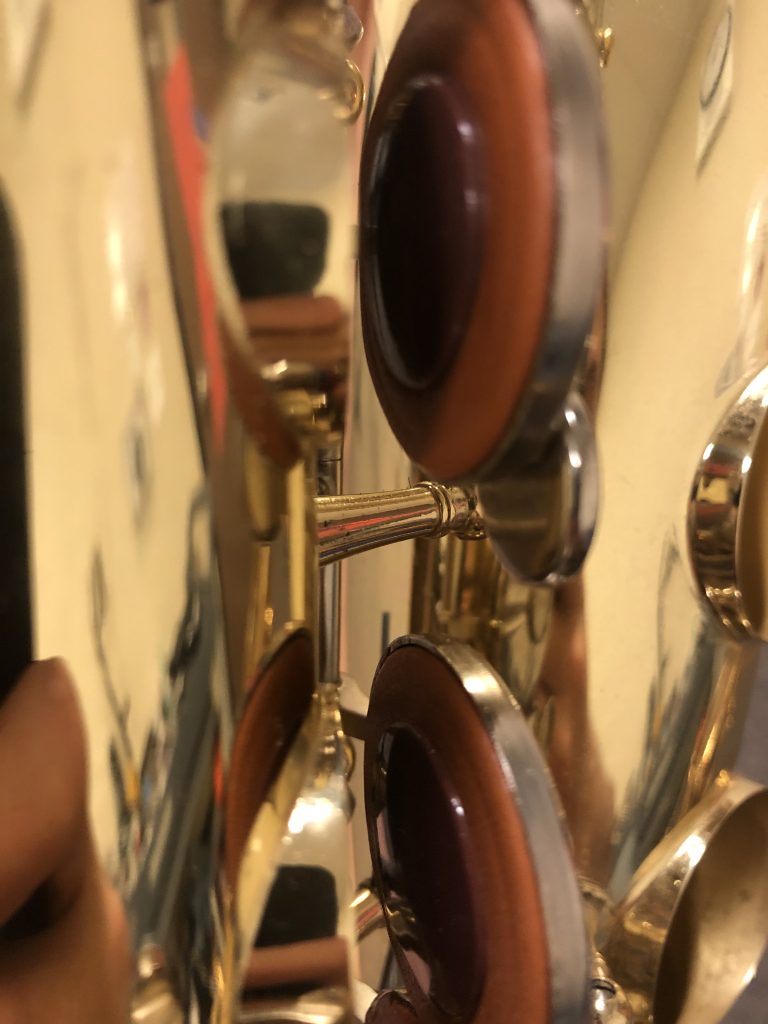 Floating consists of using a leak light on saxophones, bass clarinets, and bassoons, and cigarette paper with other, smaller woodwinds. Leaks on larger instruments show as slivers of light from the leak light as the key closes. With smaller instruments, areas of the pad that the cigarette paper can fit under signify a leak. Once the leaks are identified, the pad cup is heated again, and the pad is pushed or pulled on the pool of melted shellac underneath. This process is repeated many times until every part of the pad contacts the tone hole at the same time and there are no more leaks. The satisfaction from getting a pad floated just right is incredibly gratifying, as is the sound of clicking the keys on a finished saxophone. The instrument makes a resonant “thoooom” when fingering a low B-flat if every key seats perfectly. I save this part for last and if the instrument does not sound resonant enough, I check every key again.