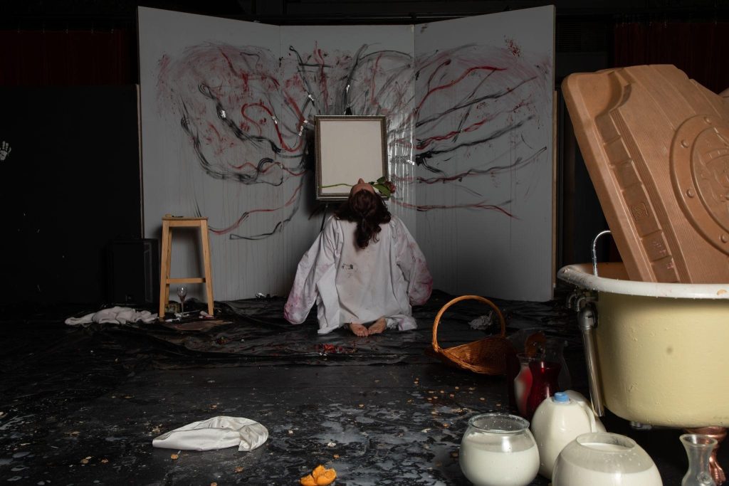 Making a Mess at its core is a gallery show that subverts common expectations around concert dance in order to question the systems “fine art” exists within. In this installation, dancers were positioned in vignettes throughout a gallery space that audience members could meander through, making the experience more intimate, three-dimensional, and engaging than works set on a traditional proscenium stage. Through experimental processes including scored improvisation and authentic movement practices, the dancers were able to develop their characters over the course of the creative process. This looked like hour-long sessions of character embodiment and improvised interactions as a method of further researching the work. The dancers worked with physical materials that are often not seen in traditional dance spaces, such as paint, fruit, and milk, as well as subject material that is often viewed as taboo in the dance world and its institutions. Many of these subject matters such as queerness, mental illness, and sensuality are permissible in other art areas like television and visual art but have been strongly discouraged in the concert dance world as a further enforcement of elitism. Making a Mess posed questions around the social systems concert dance exists within, including class, race, and gender identity.