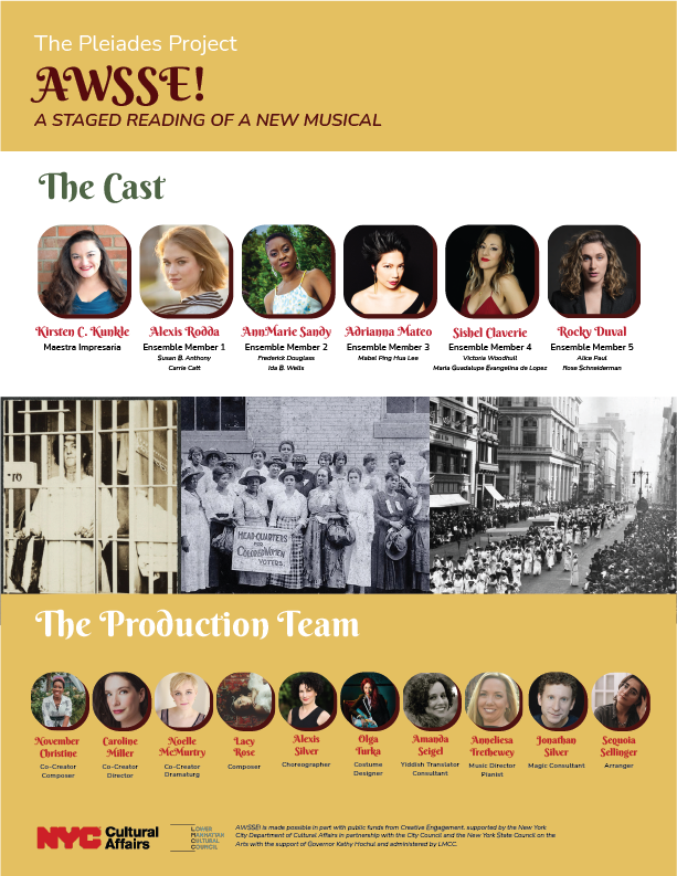 With a mission to approach the women’s suffrage movement from an intersectional perspective, The Pleiades Project team decided to create and produce a new music-theater work, exploring the successes and failures of this milestone event in American history. After being awarded a generous Community Engagement Grant from Lower Manhattan Cultural Council in April of 2020, A Women’s Suffrage Splendiferous Extravaganza! (AWSSE!) was born. With the addition of November Christine (Co-Creator, Writer, Lyricist, and Composer) to our creative team, we tackled the initial stages of developing new a music-theater work. How do we transform AWSSE! from an enthusiastic idea into its upcoming realization as a live staged reading? We then proposed a simple, but crucial beginning that would anchor all of our subsequent work –what stories do we want to tell about women’s suffrage, and how do we want to tell them? After much discussion, we centered the narrative arc of AWSSE! around three aspects of the women’s suffrage movement: